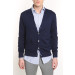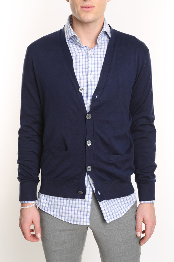 V-neck cardigan. Mother of pearl front button closure. Two dart pockets. Ribbed cuff and hem. 100% cotton. Hand wash.
