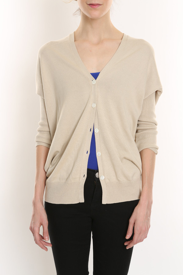 Oversized knitted silk blend cardigan. Front button closure. Ribbed hem. Silk/rayon. Dry clean.
